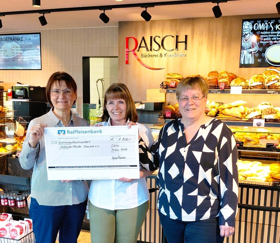 Hocherfreut konnten am 09.04.2026 die Vorsitzende Ursula Wolf und Einsatzleiterin Waltraud Nägele des Vereins Helfende Hände Seewald e.V. einen Scheck in Höhe von 1.100 Euro von der Bäckerei Raisch in Empfang nehmen. Überreicht wurde der Scheck durch Adelheid Mast, Bezirksleiterin der Bäckerei Raisch. Die Spendensumme kam bei dem Probelauf zur Eröffnung der Filiale in Seewald zustande. Unter dem Motto „Frühstücken gegen eine Spende“ startete die Firma Raisch ihren Betrieb in Besenfeld. Der Verein bedankt sich deshalb auch bei jeder Spenderin und jedem Spender ganz herzlich.